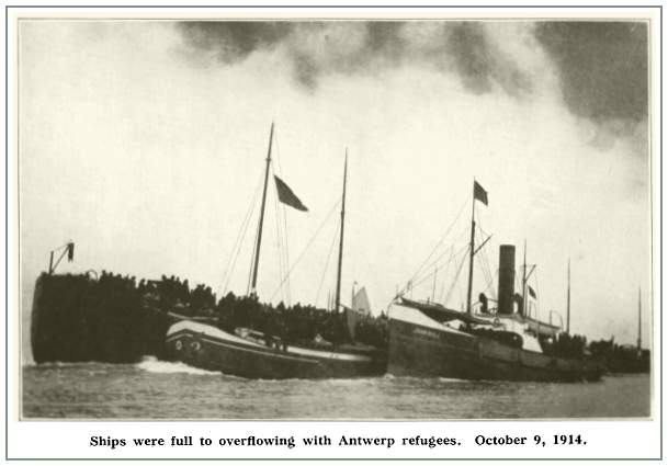When I arrived in Flushing it already harboured several thousand refugees. Pale, haggard, and many of them still with nerves vibrating from the sound of the shells, they crowded into the little Dutch port, hoping to find there a haven of safety. Every train from Roosendal brought more of the refugees. All day, boat after boat had steamed down the river crowded to the rails with those who wanted to escape from Antwerp.