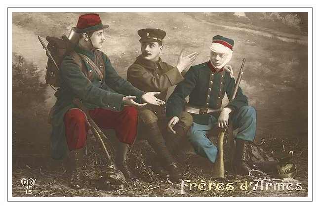 Brothers-in-arms : French and British soldiers help out a wounded 'poor little' Belgian