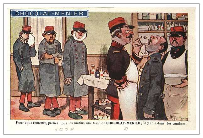On sick-call : 'To get better, have a cup of Chocolate-Menier everyday. Available in the cantine.