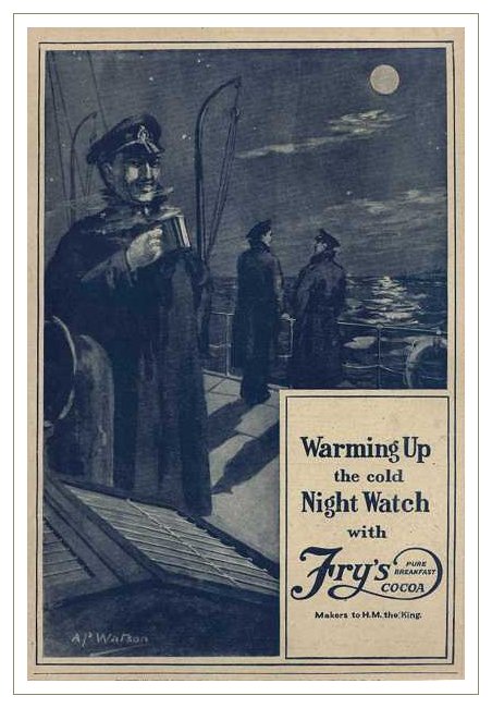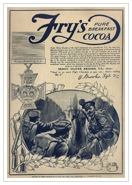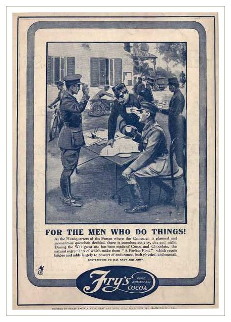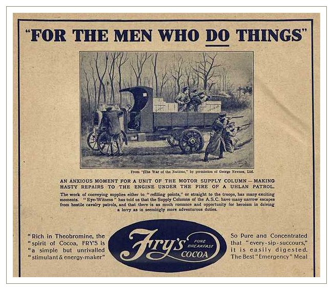 This collection of advertisements is taken from the back page of the weekly newsmagazine 'The War of the Nations', a high class publication. It would appear that cocoa manufacturers thought their beverage the ideal drink for soldiers in the field : healthy and yet stimulating without any of the unhealthy negative connotations associated with drinks such as coffee or alcoholic beverages.