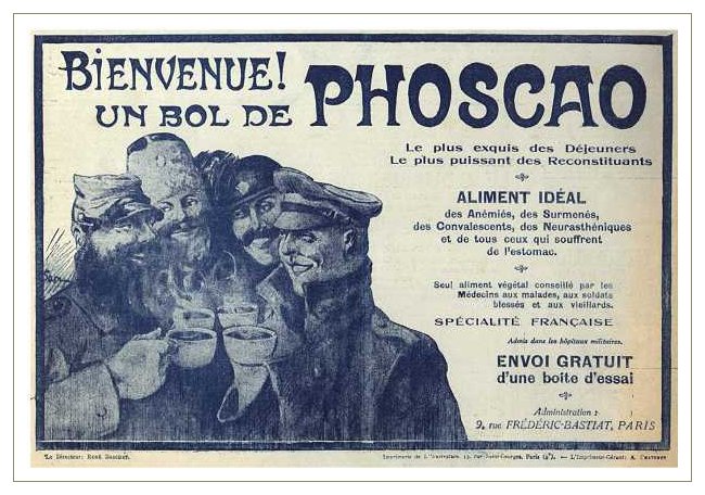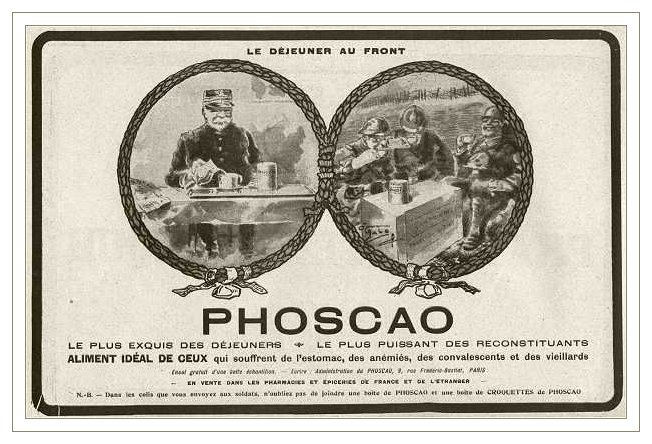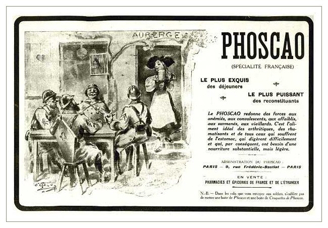 Here we have a collection of ads for a French cocoa drink : Phoscao, not only a delicious fortifying cocoa drink, but also ideal to cure anemia, neuresthalgia and stomach problems.