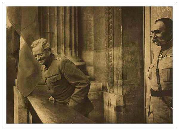 In the chapel before the tomb of Napoleon Gen. Pershing received American flags and banners from the hands of President Poincaré. Almost the entire history of the struggles of the French against the Germans looked down upon the scene from paintings portraying heroic incidents in French battles from Charlemagne to Napoleon. There was a sharp contrast between the khaki and plain wide brimmed hats of Pershing's men and the gay dress of d'Artagnan's plumed musketeers and Napoleon's grenadiers.