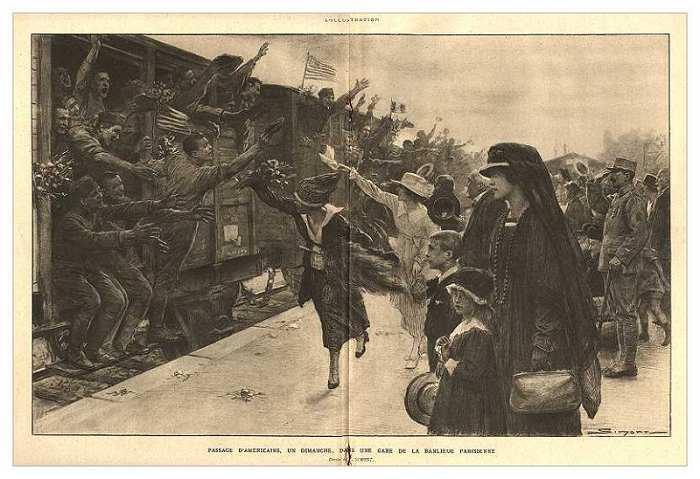 "Vive les Americains!" "Vive Pershing!" "Vive les Etats-Unis!" shouted over and over by the crowd greeted the American standard bearers as they advanced.