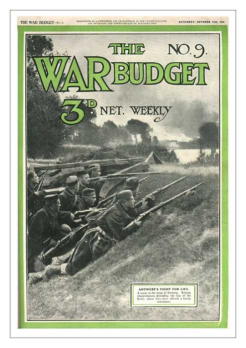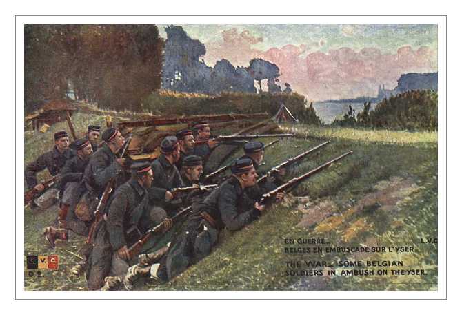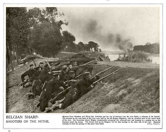 This photo of Belgian soldiers in positions behind the river Nethe nearby Antwerp was one such instance. Though certainly not a posed photograph judging from the positioning of the soldiers, it had a certain dramatic flair and lent itself to all manner of heroic interpretaions. While this small section of Belgian troops were probably doing nothing more than sheltering behind a river embankment, news editors thought it permissible to describe them as 'sharpshooters' or soldiers fighting for the life of Antwerp. Publishers were not even above changing venues of location if it served their purposes, as can be seen in a hand-colored British postcard version above. From the banks of the Nethe to the banks of the Yser : a river is a river and the latter was at the time world-renowned, so why not have the gallant little Belgians defending that bit of real estate instead of a river nobody had much recollection of.