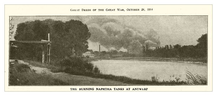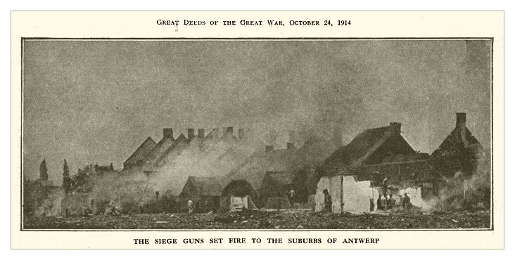 Along the dock-side, and as passive as though hewn in one piece with it, a crowd of Antwerp's citizens are standing. They stand awfully dumb, quiet, dreadfully immobile; they are massed and sculptured in lines of catastrophe that would be the despair of Rodin. Behind them, against the heavy dawn, Antwerp burns. The pulse of a hundred fires are flickering on the sky, and above the flames the thick smoke rolls. Down near the river the naphtha tanks are flaring, and the thick fume of the burning makes a pall of the deepest black over the doomed city. Behind, the canopy of smoke is laced with plunging shells. The earth shakes at their huge explosions; houses are being shattered and palaces battered to rubble. The great town appears merely an empty shell of smoke-blackened ruin, with no life save the fires of destruction burning sullenly within its heart. The town is destroyed; but it is not that which matters. That is not the Tragedy of Antwerp. Not in crumpled ruin or in shattered Gothic does the tragedy of these brave, pitiful people lie. It lies here, massed along the dock-side, and it is written in wailing on all the roads leading to the coast and to the hospitable Holland border. It is the tragedy of a people ruined, of a people destitute, starving, homeless, and torn from all ties that are dearest and most tender, by the ruthless hand of war.