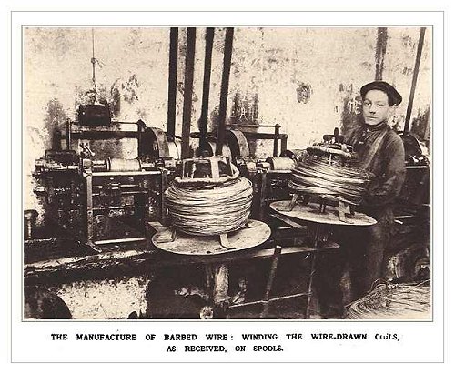 Three twist barbed wire, the form of barbed wire used in the war, is made by means of a very ingenious machine the object of which is to plait three galvanised wires. Two of these form the body of the wire; the third serves to form the barbs. In the course of the plaiting operation, these barbs are automatically wound on one of the wires which is joined up to the second through the agency of rollers. The twist is then effected, and the barbed wire, as each length becomes terminated, is wound off on to a frame which facilitates its subsequent unwinding. The illustrations opposite show a machine in one of the factory workshops. As the mechanism works, a small knife automatically determines the place of each of the barbs of one of the wires of the twisted strand.