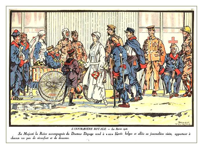 - an illustration by James Thiriar of Queen Elizabeth and doctor Depage (in khaki right of the queen)