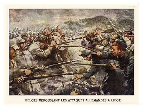 Vers 1 heure, mes sentinelles tirent des coups de feu et, au même instant, les différents bûchers s'allument. Alors commence une fusillade intense, partant surtout de la route principale Herstal-Vivegnis, fusillade à laquelle répondent la mousqueterie et les mitrailleuses allemandes. Au bout de quelques minutes, le feu décroît, se perd dans l'éloigne-ment; en effet, l'ennemi est obligé de se retirer; mais il ne tarde pas à revenir en plus grande force par des rues parallèles. De nouveau notre tir l'oblige à la retraite; alors il se jette dans les jardins, traverse les maisons et s'avance par la rue qui coupe perpendiculairement la route Herstal-Vivegnis. Cette rue est balayée dans toute son étendue par les tireurs cachés dans les maisons bordant la droite de la place; après avoir subi des pertes épouvantables, les Allemands sont contraints de s'enfuir et de s'abriter dans les jardins. Déjà, d'autres troupes paraissent et tentent de forcer le passage. Les attaques se succèdent sans interruption. Aux commandements, aux ap- pels, aux cris de « Vorwaerts » se mêlent les détonations de la fusillade et le bruit sourd des corps qui tombent. Des groupes de fantassins allemands sont étendus dans les rues, à intervalles égaux, les mains crispées sur la crosse de leurs fusils, gardant leurs rangs même dans la mort. Ils sont là, étalant leur poitrine déchirée par les balles, leur éventrement hideux. Du sang gicle sur les trottoirs, sur les pavés, sur la façade des maisons, du sang partout. Des bûchers, une belle flambée illumine cette scène de carnage, les flammes dansent, sautent, s'enlacent en guirlandes d'or, faisant monter et courir le long des murailles des ombres allongées...