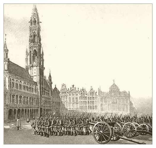 When we got back to the Legation I decided that I ought to see all I could, so Blount and I went back in his car. First we worked our way through to the lower town and got a look at the Grande Place. There were a little more than two full battalions resting there, with their field pieces parked at the lower end of the square. Small squads were being walked around doing the goose step for the delectation of the bons Bruxellois, who were kept a block away up the side streets leading to the square. The men had their arms stacked in the centre of the square, and were resting hard - all but those who were supplying the spectacle.