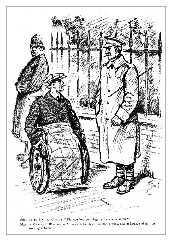 Man in chair : "Bless me, no ! Wish it had been bullets. I was a stay-at-home, and got run over by a tram."