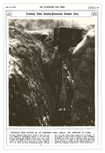 What a "scoop" this was. It was the first film that had actually been taken of a British attack. What a record. The thing itself had passed. It had gone; yet I had recorded it in my little 7- by 6-inch box, and when this terrible devastating war was over, and men had returned once again to their homes, business men to their offices, ploughmen to their ploughs, they would be able to congregate in a room and view all over again the fearful shells bursting, killing and maiming on that winter's morning of March 27th, 1916.