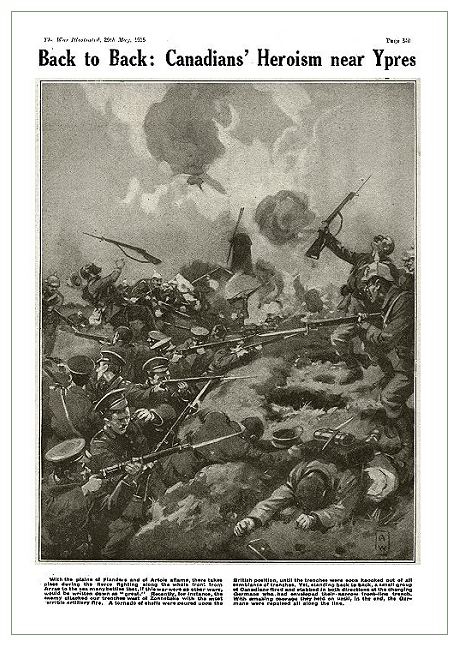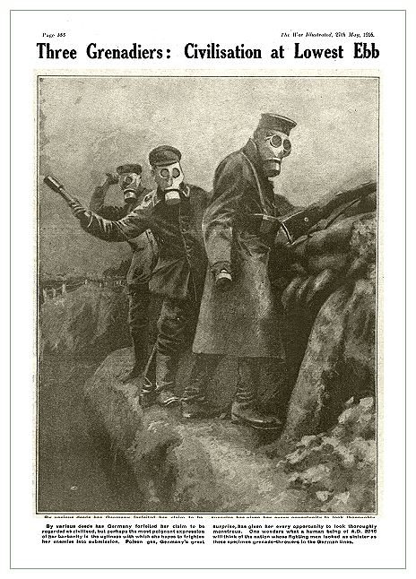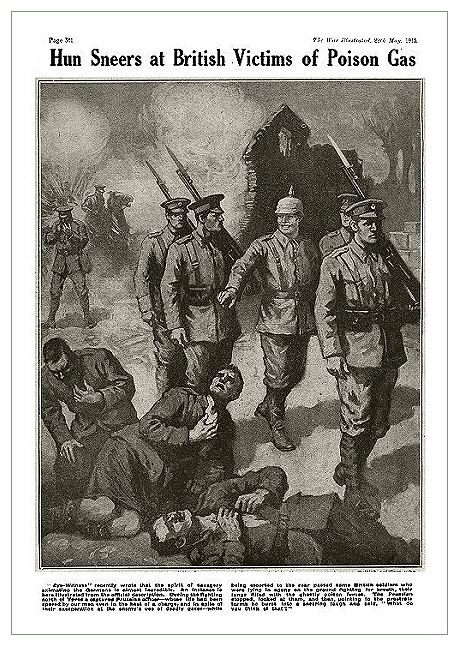 Right :" 'Eye witness' recently wrote that the spirit of savagery animating the Germans is almost incredible. An instance is here illustrated from the official description. During the fighting north of Ypres, a captured Prussian officer - whose life had been spared by our men even in the heat of a charge and in spite of their exasperation over the use of deadly gases - while being escorted to the rear passed some British soldiers who were lying in agony on the ground fighting for breath their lungs filled with the ghastly poison fumes. The Prussian stopped, looked at them and then pointing to the postrate forms he burst into a sneering laugh and said - "What do you think of that ?"