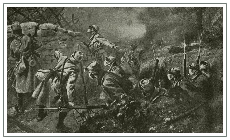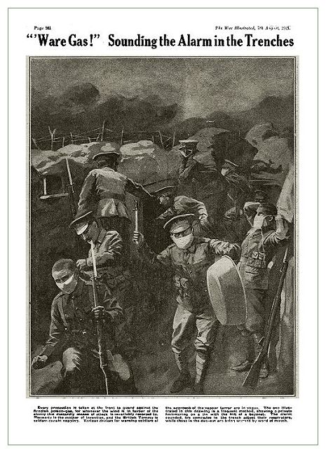 Left : "Every precaution is taken at the front to guard against the fiendish poison-gas. For whenever the wind is in favour of the enemy, this dastardly means of attack is resorted to. Necessity is the Mother of Invention and the British Tommy is seldom caught napping. Various devices for warning soldiers at the approach of the vapour terror are in vogue. The one illustrated in this drawing is a frequent method showing a private hammering on a tin with the hilt of his bayonet. The alarm sounded, his comrades in the trench adjust their respirators while those in the dug-out are being warned by word of mouth."