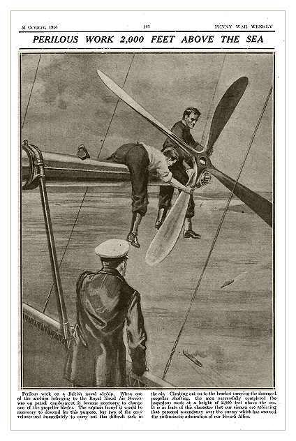 More thrilling, however, than even an air fight was the feat accomplished at a dizzy height by a British artificer who displayed great daring and courage in repairing damage done to an air-ship. If the story had appeared in a work of fiction it would have been regarded as impossible. But it happens to be true.