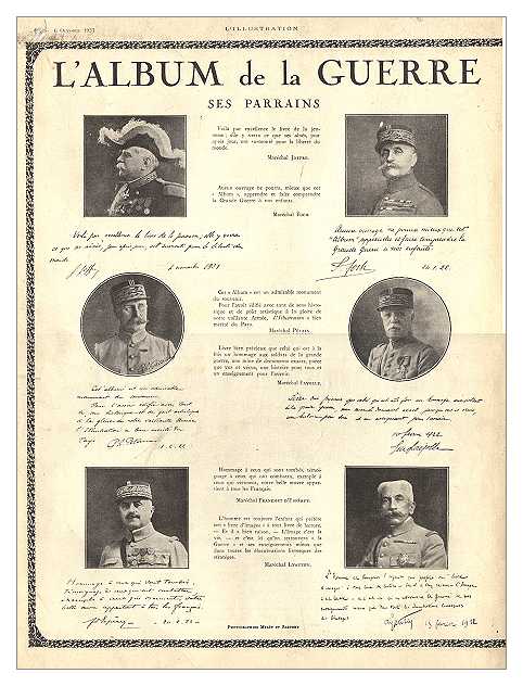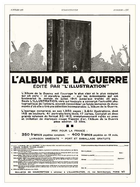 Aside from the 2 volume Commemorative Album, all war-time issues of L'Illustration, from July 1914 til July 1919 were either reprinted or bound into volumes from existing war-time surplus issues. Aside from single reprints which were indicated as such on the front outside cover, the other contents being faithfully reprinted, a vast (and extremely weighty) 10 volume leather bound special collection of all war time Illustration issues was also published during the 1920s. These are somewhat more difficult to find nowadays, but are well worth acquiring. Anyone wishing to learn more about the Great War from a French perspective, to try and grasp the feeling and mood of the times as it was experienced in war-time France, is best advised to start with the contents of 'l'Illustration'. No other contemporary publication comes close, no other publication achieves such graphic and artistic excellance.