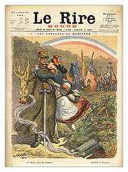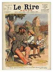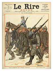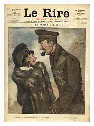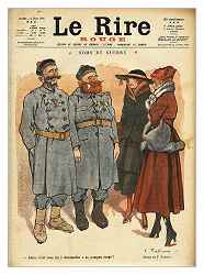 Upon outbreak of war in August 1914, 'Le Rire' along with many other French periodicals, ceased publication for a while, thereafter reappearing with somewhat altered contents. In the case of 'Le Rire', war-time issues were renumbered starting with number 1 and the name was changed into 'Le Rire Rouge' (The Red Laugh), the color 'red' most likely being symbolic of the blood of the soldiers of France, shed in defense of the country. 'Le Rire Rouge' also changed policy in regards to contents, almost all illustrations having to do with the war in some manner or other. Decidedly, it was a fiercely patriotic publication, if not one tempered by a comradely egalitarian admiration and gratitude for the courage and bravery of the soldiers of the Republic, the poilus of France. The common soldier became the true hero in the war-time pages of 'Le Rire Rouge', gifted with good cheer, a dogged determination to see things through and more common sense than all the politicians of the Assemblée, or the whole world for that matter, put together.
