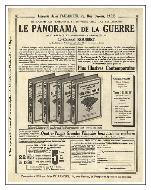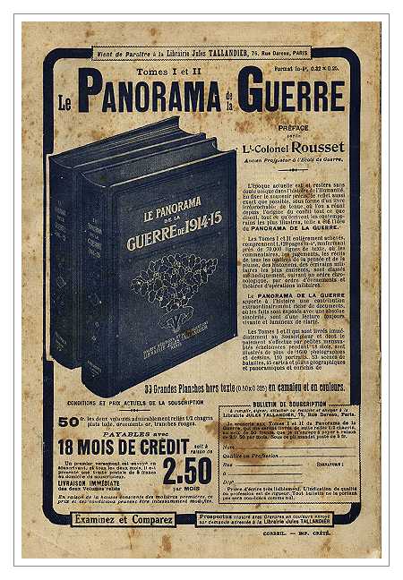 After a set number of weekly issues appeared they were generally boundt in an elegantly manufactured binder. After the war, surplus issues were ready binded in 6 large volumes along with a special 7th 'Victory Album' pertaining to events after November 11. Just as with leather bound volumes of 'L'Illustration', the 7 volume set of 'Le Panorama de la Guerre' was sold in vast numbers and was of such obvious worth that these volumes were seldom thrown away. Consequentially they are rather easy to find on the secondhand market even now and are well worth acquiring.