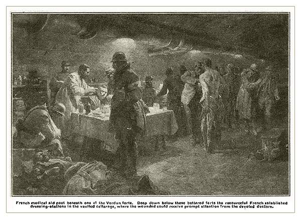 As soon as a soldier falls he drags himself, if he is able, to some sheltered spot, or his comrades carry him there, and with the "first-aid" packet, carried in the breast pocket of the tunic, an endeavour is made to give the wound temporary treatment. In the British service this "first-aid " kit consists of a small tin box, not much larger than a cigarette case, containing a bottle of iodine crystals and a bottle of alcohol wrapped up in a roll of aseptic bandage gauze. Meanwhile word has been passed along the line that the services of the surgeon are needed, for each regiment has one and sometimes two medical officers on duty in the trenches. It may so happen that the trench section has its own poste de secours, or first-aid dressing-station, in which case the man is at once taken there.