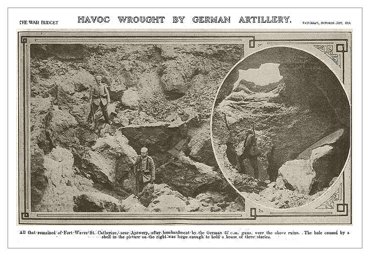 The effect of their terrible fire we have learnt not only from Antwerp, but also from Namur and partly from Liege. Antwerp's double ring of mound-like fortifications, though they are of solid concrete and tempered steel, were quite unable to withstand the awful impact of the shells. A few shells, some say four, some say a dozen, were enough to reduce the stoutest of these works to mere powder and to decimate utterly the garrison. The shells, dropping almost in a straight line from the sky on to the forts, have simply shattered them like egg-shells with the driving weight of the enormous blow, and the gases released by the tremendous detonation turned to dust everything that withstood its force. This much was proved by Namur, and this much Antwerp also proved. It was not necessary to have many of these guns in action; at Antwerp there seems to have been but two or four lit the most. All that is necessary is to concentrate the deadly fire of one-ton shells, each strike with a 5,000 foot-ton energy, on to a single fort until at fort is reduced to ruin, and then to take one's time and concentrate on another. At Antwerp the Germans reduced one fort in this way, and through the gap thus caused poured forward, unimpeded by the fire of big guns, on to the inner works.