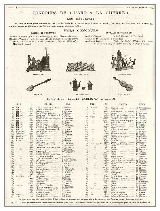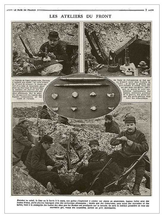 During the war, the French newsmagazine 'Le Pays de France' organised a trench art contest. Soldiers were encouraged to send in their creations which would then be judged by a no doubt learned panel of experts, according to their artistic or other intrinsic merits. Cash prizes were then awarded to the winning entries. During the contest, the newsmagazine ran up to several pages of photos each week of some of the more photogenic items.