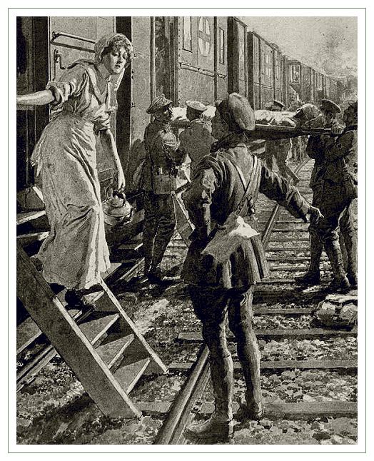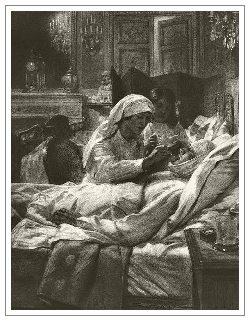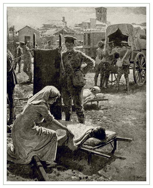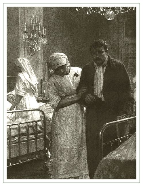 Here are two illustrations depicting nurses, taken from an edition of the French magazine L'Illustration. Matania's work was usually published in grey or sepia tone, even though magazines such as L'Illustration normally printed lavish color illustrations in each edition.