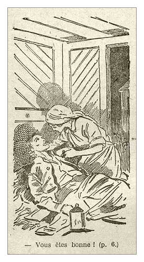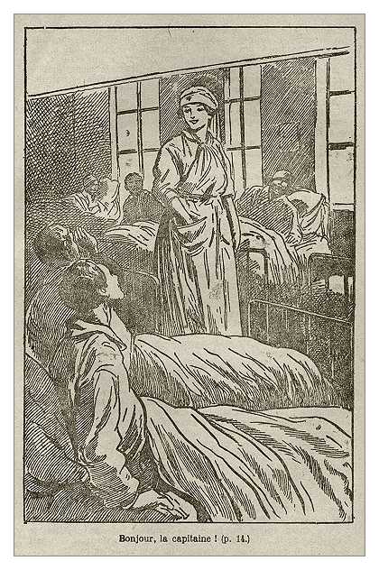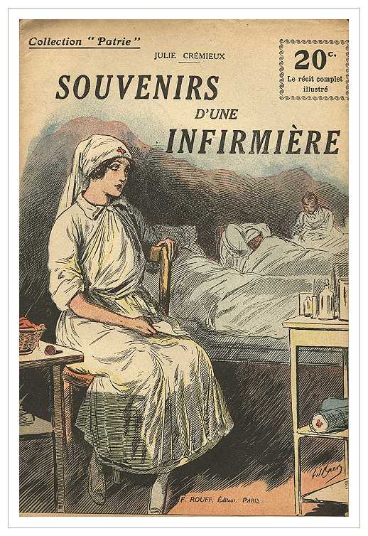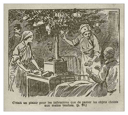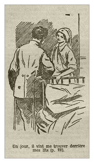 Here is a series of line drawings from a cheap war-time novelette depicting what were perceived to be typical activities of a French nurse. In the popular mind, nurses were expected to be good cheerful companions, showing motherly care for wounded soldiers, rather than professional medical training. Reality tended to be somewhat different.