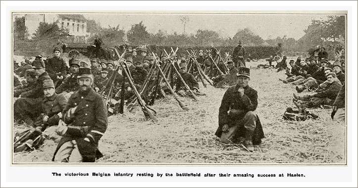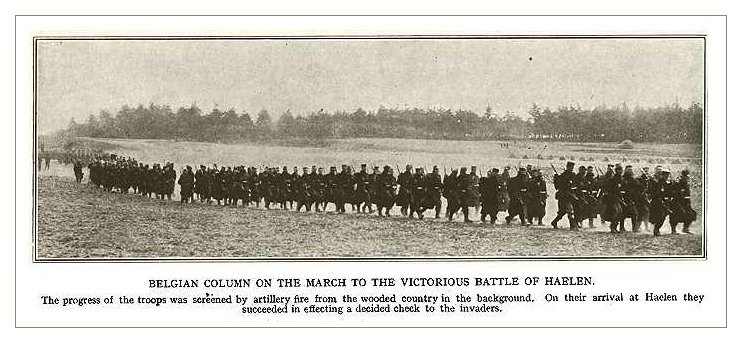 Soon after leaving Haelen, on our way back we met a corps of bicycle carabiniers who were rolling along toward Haelen at top speed. The officer in command held us up and asked us for news of the country we had covered. He seemed surprised that we had not seen any German forces, for he said the alarm had been sent in from Haelen and that there were strong forces of Belgians on the way to occupy the town and be ready for the attack. When he had left us, we ran into one detachment after another of infantry and lancers coming up to occupy the little village.