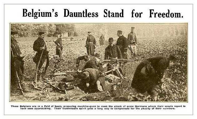 Then shrapnel had been brought into play, to set the houses on fire and bring the German troops out into the open. Then they had charged the Belgians across an open field and apparently with disastrous results. Part of the ground was in hay which had already been harvested and piled in stacks, the rest was in sugar beets. The Prussians had charged across the field and had come upon a sunken road into which they fell helter-skelter without having time to draw rein. We could see where the horses had fallen, how they had scrambled to their feet and tried with might and main to paw their way up on the other side. The whole bank was pawed down, and the marks of hoofs were everywhere. The road was filled with lances and saddles, etc. All through the field were new-made graves. There was, of course, no time for careful burial. A shallow trench was dug every little way-a trench about thirty feet long and ten feet wide. Into this were dumped indiscriminately Germans and Belgians and horses, and the earth hastily thrown over them - just enough to cover them before the summer sun got in its work.
