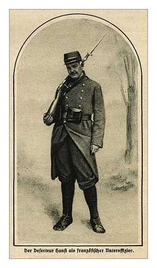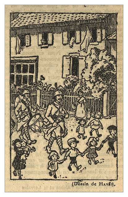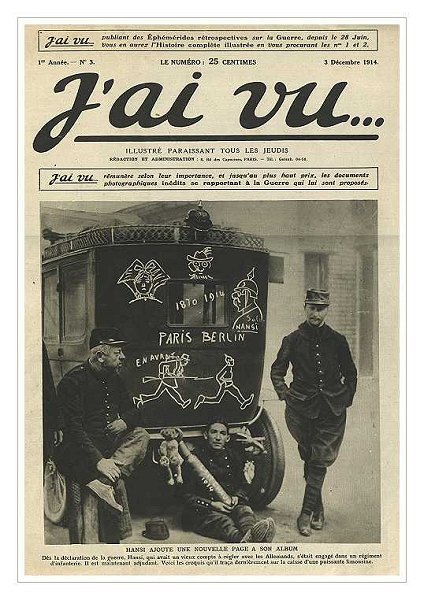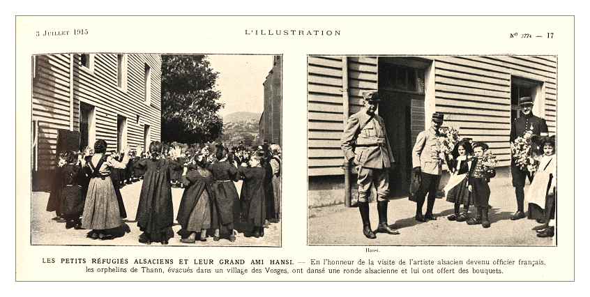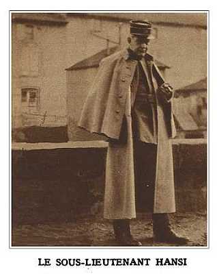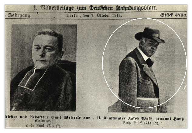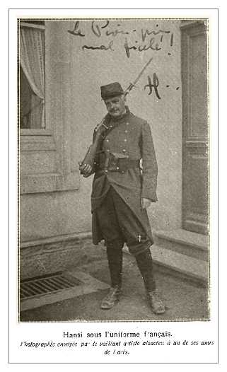 Upon outbreak of war 'Hansi' served in the French army while continuing to create patriotic illustrations. He was famous enough to have his portrait printed in several prominent magazines, even on the cover page. German magazines printed his portrait as well, but describing him as deserter, which technically speaking was correct, for being Alsatian he was a German citizen.