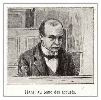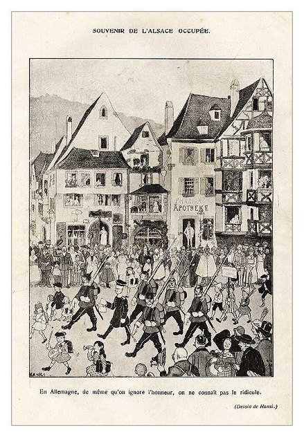 'Hansi' was the pseudonym of the Alsatian artist Jean Jacques Waltz. Although during 1871-1919, Alsace and Lorraine were part of the German empire, many of its inhabitants remained French in sentiment. Undoubtedly J.J.Waltz was of such thoughts. He was a talented landscape artist and before the war, the French newsmagazine 'L'Illustration' published his work, accompanied by articles expressing the wish to be re-united with France. In July of 1914 he was sentenced to one year in prison in Germany for making fun of German officials in a book of illustrations, but he managed to escape to France.