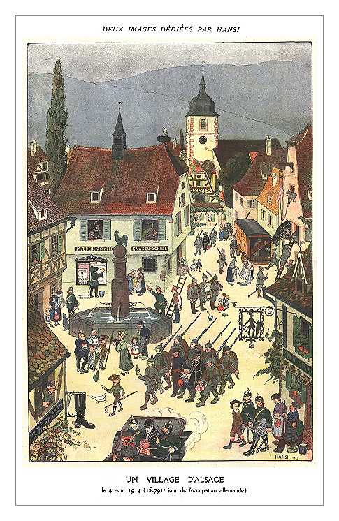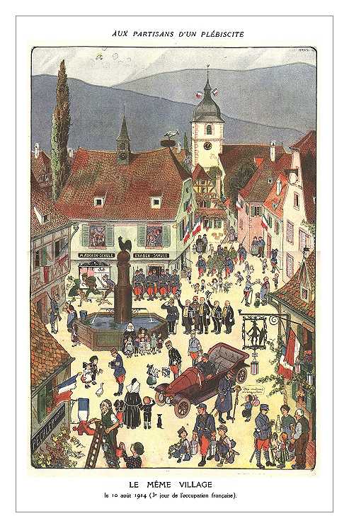 The 2 illustrations were printed in the same issue of 'L'Illustration' and are titled 'An Alsatian Village - on the 4th of August 1914 during the German Occupation' and 'The Same Village - on the 10th of August, 3 Days after French Occupation'.
