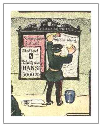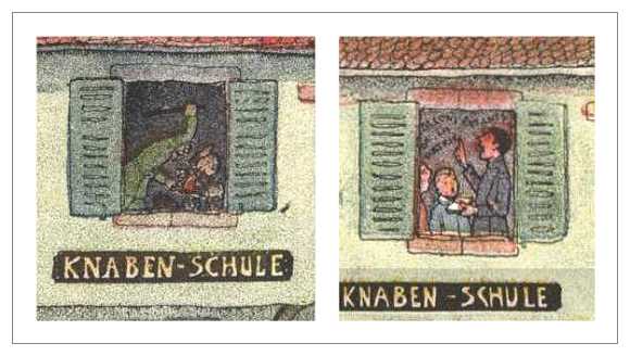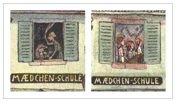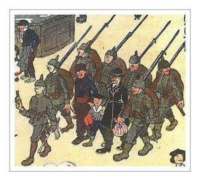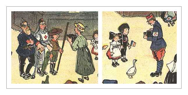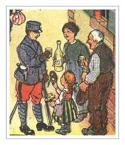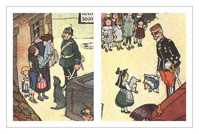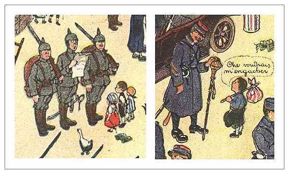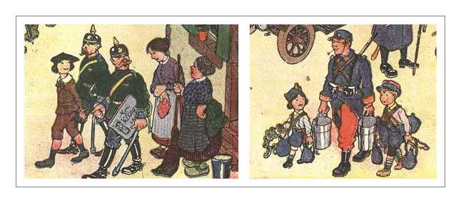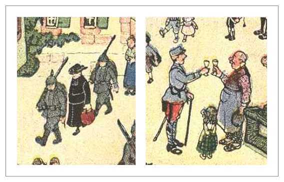 In the one we see an oppressed and thoroughly miserable native population under the brutal heel of the German army, in the second we see a joyous and thankful local population giving thanks to the liberating French forces. In the following enlargements we see on the left of each double illustration opposed scenes of life under German rule and then on the right of life under French government, all according to Hansi of course.