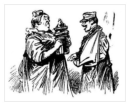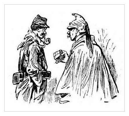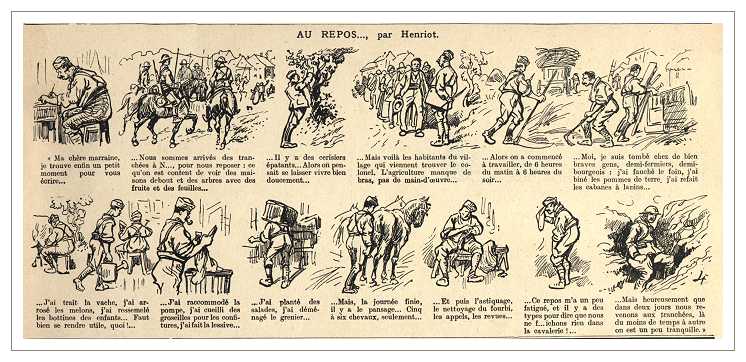 The following drawings are taken from the pages of L'Illustration. A weekly editorial comic strip was drawn by artist Henriot (pseudonym of Henry Maigrot : 1857 - 1933) as a regular feature. It was usually placed on the back inside cover amongst the advertisements, probably indicating that that while amusing it was not to be taken as seriously as the other content of the magazine. Nevertheless Henriot produced very modern looking drawings-sketches that were captioned with commentories of all sorts : political, social, comical and what not. During the Great War years, a large proporation of his weekly work was naturally dedicated to the war. His characters were the quintessential French poilu, sometimes sloppy, dirty or bored to tears by life at the front but always patriotic and willing to fight for la Patrie. Henriot usually depicts scenes of everyday life : soldiers talking (or more likely griping) to one another or to an old-timer, soldiers engaged in disputes with officers, soldiers looking forward to receiving mail or a package from a 'Marraine' (godmother), soldiers standing on guard or soldiers on leave.