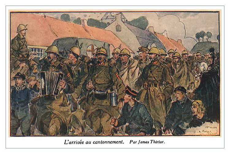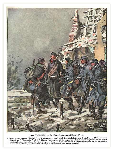 James Thiriar was a Belgian artist from Brussels. He fought as member of the 'Garde Civique' (cival guard) and was wounded during the early days of the war. He later escaped to London and joined the regular Belgian army. The Illustrated London News and other periodicals published his drawings. A series of his watercolors depicting life on the Yser and behind the front lines was used as heading for writing paper that was sold to raise money for wounded Belgian soldiers and convalescent homes. Like most Belgian war-time artists, he was not particularly interested in depicting military scenes involving battle or combat. Instead he preferred to illustrate the everyday life of soldiers behind the front lines and like many artists at the time, he was fascinated by the enormous destruction caused by the war and by scenes of ruins and embattled landscapes and destroyed villages. Then again he was a very proficient illustrator of military uniforms and of 'types' of soldiers, as can be seen in many of his line drawings.