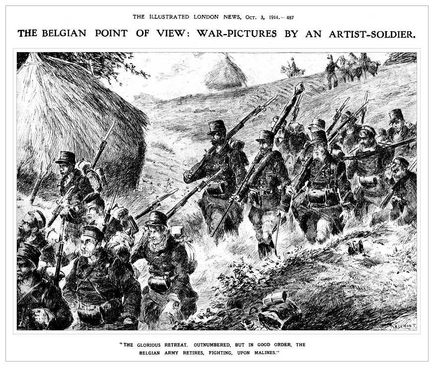 An early war drawing by James Thiriar depicting the retreat of the Belgian Army from Liege in August 1914.