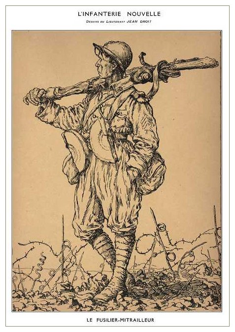 This series of 10 drawings by french lieutenant Jean Droit was published in l'Illustration in 1918. It is entitled 'L'Infanterie Nouvelle' (the new style infantry) and is probably meant to be a tribute to the prowness and determination of the french infantryman. Indeed the soldiers we see portrayed here are a far cry from the red-pantaloon and red képi uniformed troops of 1914. These are illustrations of the modern French soldier, battle-hardened, tough and well-equipped with the most up-to-date weapons.