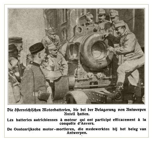 The capture of Antwerp was a victory for Germany of course and as such, it was covered extensively in the Kriegs Kurier. There are few photos of the destruction caused by the fighting and fewer if none of actual combat. Nevertheless there are a number of very interesting photographs worth reproducing, including several of Austrian troops.