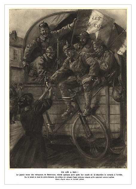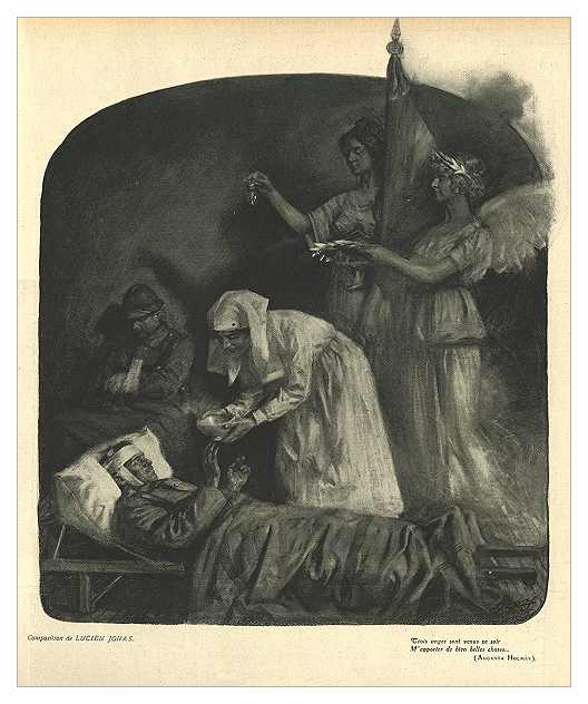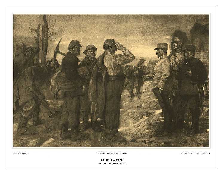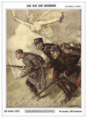 Even though French artists such as George Scott and Francois Flameng are now better known, Lucien Jonas was perhaps the consummate and most representative French war-time artist of them all. His work was published in hundreds of different publications and books, both in Allied and Central Powers countries and so helped determine how people viewed the war in terms of mental imagery. Mixing veracity and allegory with a heavy dose of patriotism, Lucien Jonas was a true master of military illustration, an effective propagandist and talented portrayor of war-time national myths and pathos. In this present day and age, his style appears at times to be heavy-handed and overly sentimental and therefore exagerratedly emotional. From his all too apparent succes during the war years, it would seem that however overbearing his work now seems, it was certainly in accord with the prevailing tastes of the time.