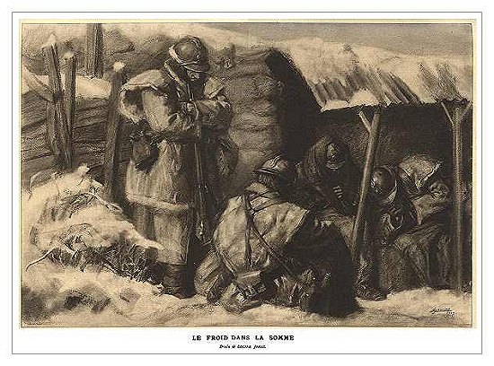 In fact, in contrast to many other French war-artists such as Francois Flameng, Georges Scott, J.Simont, L. Sabbatier etc. from the start of the war the work of Lucien Jonas was quite somber and bleak, full of pathos, suffering and religious symbolism combined with a fierce patriotism and love of France. He portrays soldiers and officers as equals in the unrelenting struggle against the Boche, both heroic and unflinching in their duty. They are one and all prepared to give their lives in the supreme sacrifice if needs be. His characters are not gentlemen engaged in war, but Gallic warriors filled with a cold fury and hatred of the German invader. His art is that of a revanchist. Germany must be made to pay. At the same time he was capable of illustrating a scene behind the front with touching tenderness and sadness, even though here too there are abundant hints that Germany is the cause of all the suffering endured by the population of France.
