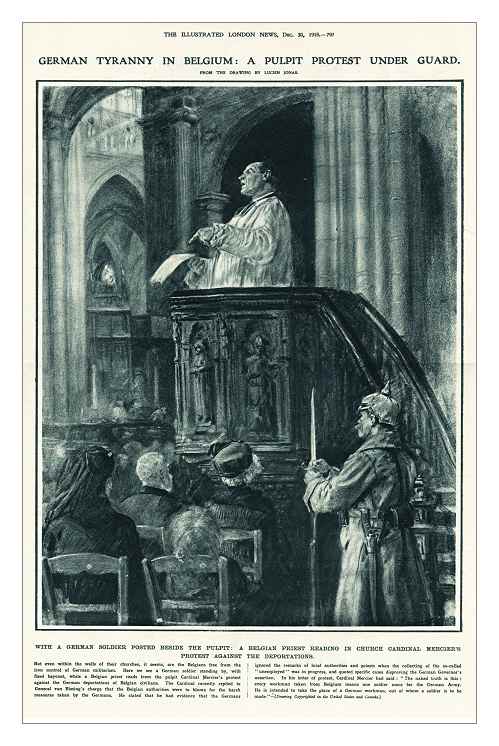 right - a Belgian priest reads a letter from Cardinal Mercier under guard