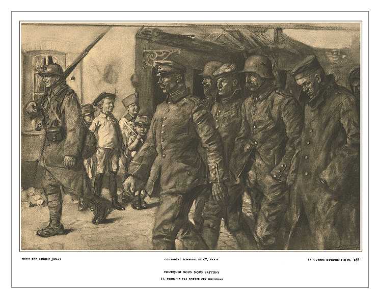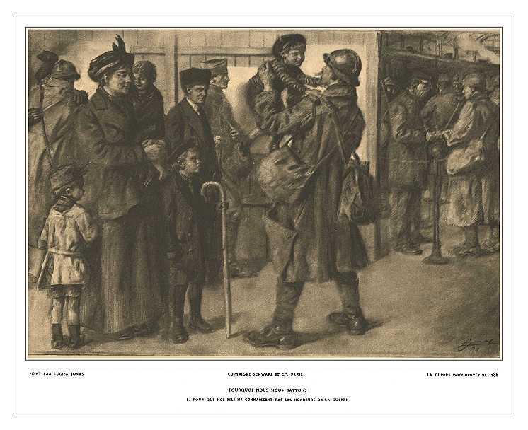 Lucien Jonas apparently held strong moral convictions on the rightness of the cause of France and was not loathe to portray such in his art. This is an 8 piece series of illustrations in which Jonas set out 8 compelling reasons 'Why We Fight'. The accompanying drawings are intended to hammer home the point. In our present day and age, such illustrations seem appear quite emotional and overstated, but at the time they must have struck a sympathetic chord in the hearts of many a Frenchman.