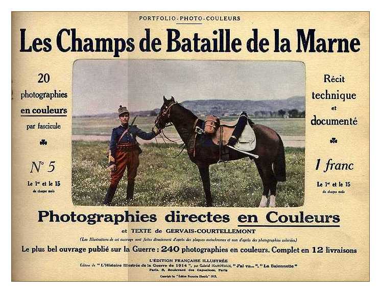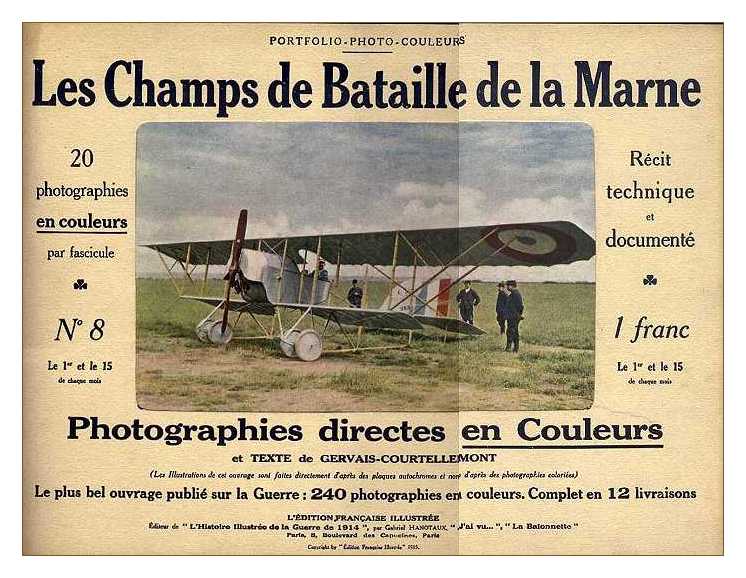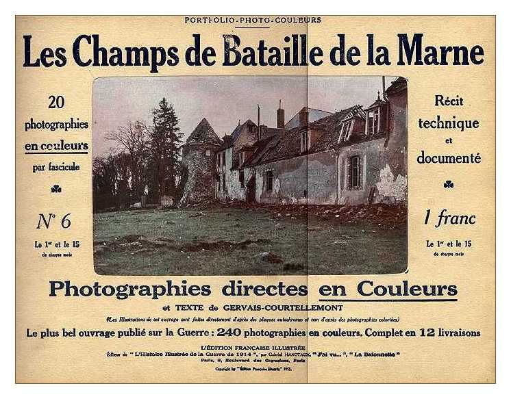 The photos were taken after the battle of the Marne by a professional photographer living in the Marne et Seine region, Monsieur Gervais Courtellemont. There are some 240 color photographs altogether in the 12 installments, a number of which are reproduced in the links below. This publication was later followed by a similar serial edition called 'Les Champs de Bataille de Verdun'. Other war-time magazines by the same publishers were 'J'ai Vu', 'La Baionnette' and 'La Guerre Aerienne'.