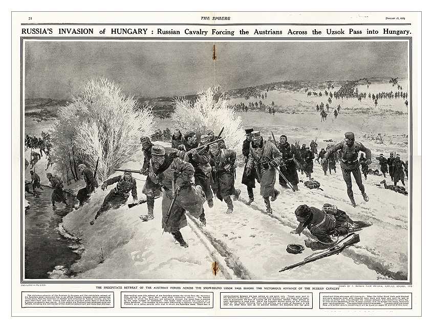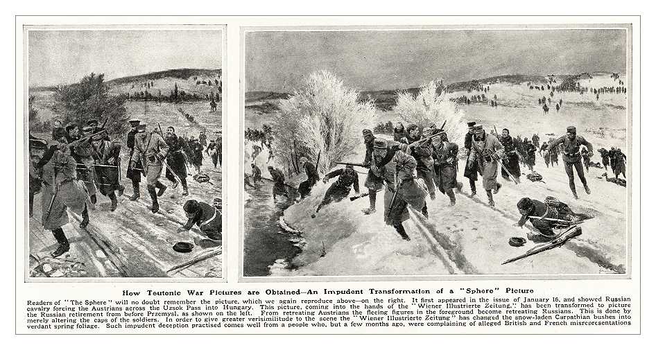 Much was made of 'the Wiener Illustrierte Zeitung' publishing an illustration that was an almost exact copy of Matania's above painting of fleeing Austrian troops, but instead subsituting fleeing Russian soldiers in a slightly different landscape with different captions. Both during and after the war, this instance of artistic laziness was made out to be yet another proof of Teutonic arrogance, as if adding a copyright violation to alledged German war crimes proved the point.
