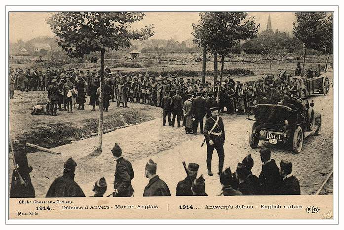 from a postcard : British marines on the outskirts of Antwerp. Note the tower of the cathedral in the distance. Belgian soldiers look on while a car with civilians (newsreporters ?) passes by. It would appear that the car is the same one in the following photograph, which could indicate that there were indeed reporters following the British troops. During the siege of the city, all motor vehicles were requisitioned by the military authorities so it is hardly conceivable that the motor car in the photograph contained civilians out for a ride.