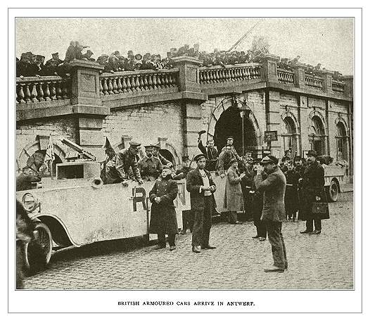 "On Monday and Tuesday the balance of the British expeditionary force, consisting of between five and six thousand men of the Volunteer Naval Reserve, arrived from the coast, their ammunition and supplies being brought by road, via Bruges and Ghent, in London motor-buses. When this procession of lumbering vehicles, placarded with advertisements of teas, tobaccos, whiskies, and current theatrical attractions and bearing the signs " Bank," " Holborn," "Piccadilly," " Shepherd's Bush," " Strand," rumbled through the streets of Antwerp, the populace went mad. The British had come at last ! The city was saved ! Vive les Anglais! Vive Tommy Atkins!"