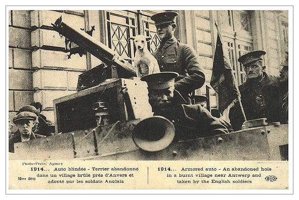 Postcard of an armoured car riding into Antwerp with a stray dog rescued from a burnt out village.