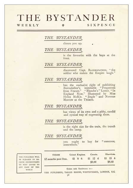 'Fragments from France' was more of an anthology than a periodical magazine. Each issue contained a number of excellent cartoons originally drawn 'somewhere in France' by Captain Bruce Bairnsfather for 'the Bystander' magazine. Even in this present day and age, they are much appreciated, the humor being easily understandable and apparently relatively timeless. Whole websites can no doubt be dedicated to analyzing and discussing the humor of Captain Bairnsfather, which was anti-authorian, irreverant, down-to-earth, pithy and crude at times and yet nevertheless managed to be patriotically British to the core and very relevant to the everyday experiences of the British soldier, both in the firing line and behind the front. He loved to make fun of stereotypes, both in the military as in the media but somehow managed to avoid ruffling too many feathers in the process. A great morale builder, his cartoons undoubtedly reflected ordinary soldiers' everyday fears, concerns and gripes in an understandable and humorous fashion.