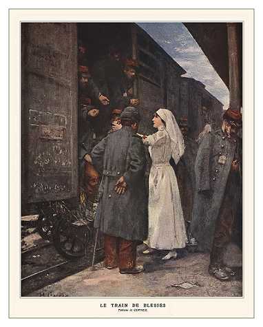 Chacun de nos wagons abrite douze hommes couchés sur des brancards. La bonne paille reçoit les moins invalides, que l'on entasse un peu partout. Cela nous fait un chargement total de trois à quatre cents blessés ou éclopés. Un long voyage de trois jours les transportera de ces plaines de l'Est jusqu'aux monts des Pyrénées, où doit s'achever leur guérison.