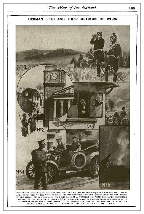 Very different circumstances attended inter-communication between spies working far away from the battle line, in the big cities and ports of England, in neutral and belligerent lands, and on the high seas. Dogs and windmills and pigeons were replaced, now, by invisible inks and newspaper codes and other strange tricks of the trade.