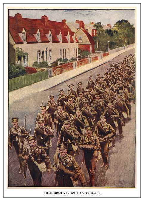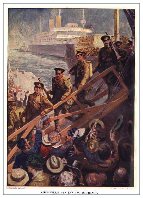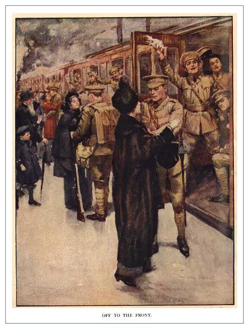 News magazines dedicated to reporting the war were very popular in Great Britain and elsewhere. There were litterally dozens of titles available to choose from. Even at as relatively late a date as May 1915, new titles were created and put on sale. Often with the opening issues, special color plates or centerfolds were included to help boost sales. In the first three issues of the new magazine 'Newnes Illustrated' these patriotically inspiring color plates of troops leaving for the front were included.
